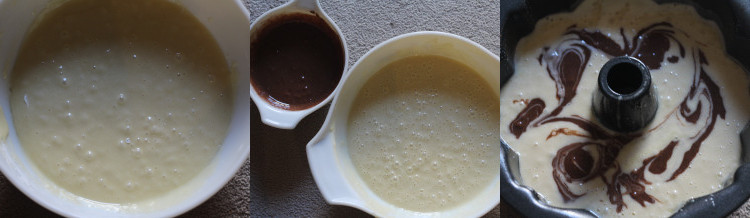 Liberally coat a bundt cake pan with spray oil. Then pour the vanilla batter into it. Drop the chocolate batter by the spoonful into the vanilla batter then swirl it all together. Let the cake sit for 3-5 minutes so the chocolate can settle at the “bottom”.